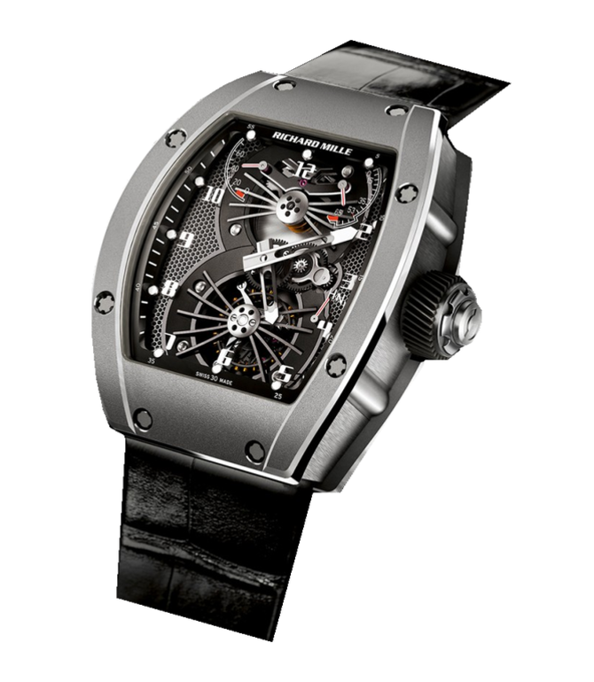 Эта модель выпущена ограниченной серией - 5 экземпляров! Корпус часов изготовлен из белого 18-каратного золота. Размеры корпуса: 48 x 39.3 миллиметров - диаметр; 19.95 - толщина. Герметичность золотого корпуса - 50 метров. Модель укомплектована ремешком из натуральной кожи аллигатора с раскладывающейся застежкой из белого золота. На циферблате указываются часы, минуты и уровень запаса хода механизма. Стекло, которым покрыт циферблат, сапфировое. Модель функционирует на швейцарском мануфактурном механизме с ручным подзаводом и функцией турбийона, производства компании Richard Mille.