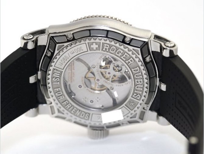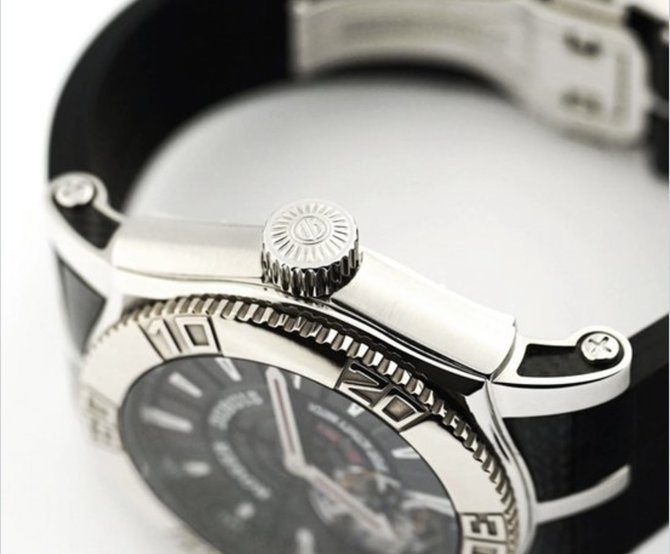 Стильные швейцарские часы для мужчин ROGER DUBUIS EASY DIVER FLYING TOURBILLON SED 48-05 SE48 02 9/0 K9.53 были выпущены ограниченным количеством в 600 экземпляров. Данная модель была использована ранее, однако является в идеальном состоянии с коробкой и инструкциями. Круглый корпус выполнен из нержавеющей стали в диаметре 48 мм. Он отличается высокой влагостойкостью - до 300 метров. Также в нем расположен механический калибр RG 02 с запасом хода на 60 часов работы и функцией турбийона, что служит для нивелирования влияния земной гравитации на точность хода. Под сапфировым стеклом на черном гильошированном циферблате показываются данные текущего времени и расположено окошко турбийона. На часовые метки и стрелки нанесен люминесцентный состав. На безеле выгравирована минутная шкала. Модель укомплектована ремнем из каучука и фирменной стальной застежкой.