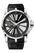 Мануфактура Roger Dubuis была основана часовщиком Роже Дюбуи и дизайнером Карлосом Диасом в 1995 году. И Роже, и Карлос были очень близки к часовой индустрии. До основания собственного бренда, Роже Дюбуи трудился в известной компании Patek Philippe, а Карлос Диас был дизайнером у Franck Muller. Все часы марки Roger Dubuis, согласно мировым часовым традициям, выполняются вручную, от отделки механизма до декора корпуса. Представленные швейцарские часы Roger Dubuis вошли в коллекцию "Еxcalibur". Их корпус, диаметром 45 миллиметров, выполнен из розового золота. В корпусе расположен швейцарский механический мануфактурный механизм с автоподзаводом. Данный механизм, отмеченный престижным Женевским Клеймом ("Poinçon de Genève"), разработан мануфактурой Roger Dubuis. Часы укомплектованы ремешком из крокодильей кожи с раскладной застежкой из розового золота. Водонепроницаемость корпуса, установленная производителем, составляет 50 метров (5 атм). Циферблат защищен сапфировым стеклом. Часы выпущены в 2009 году.