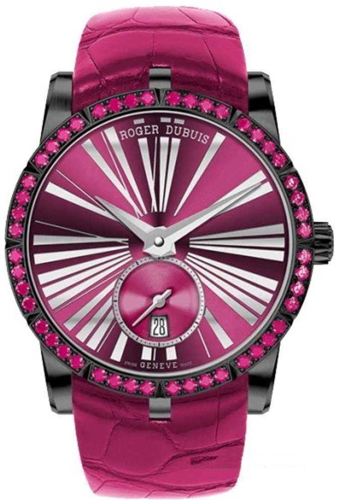 Истинно женская модель швейцарских часов - это Roger Dubuis Excalibur Essential RDDBEX0595, что была представлена в ярко розовых тонах. В розовом цвете здесь выполнено, практически, все - ремень из натуральной кожи аллигатора, пластина циферблата, а безель инкрустирован розовыми драгоценными камнями - розовыми сапфирами в количестве 48 штук. Часы выпущены в ограниченном количестве - 88 экземпляров. На защиту циферблата мастера установили сверхпрочное сапфировое стекло. Корпус из чистого титана сверху, для повышения срока службы, покрыт покрытием DLC.