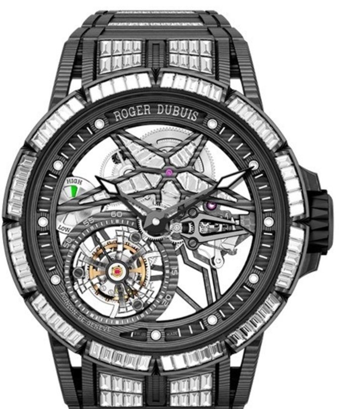 Часовщики Roger Dubuis при производстве данной версии часов украсили корпус и браслет из карбона белыми багетными бриллиантами. В 45 миллиметровом корпусе удалось зафиксировать механизм мануфактурной разработки знаменитого бренда Roger Dubuis - калибр RD508SQ с ручным подзаводом и запасом хода в 70 часов. Модель имеет серьезное часовое усложнение в виде турбийона для нивелирования влияния земной гравитации на точность хода механизма. На циферблате через стекло из сапфира указываются часы, минуты и секунды. Водонепроницаемость корпуса - 50 метров. Лимитированная серия - 8 экземпляров.