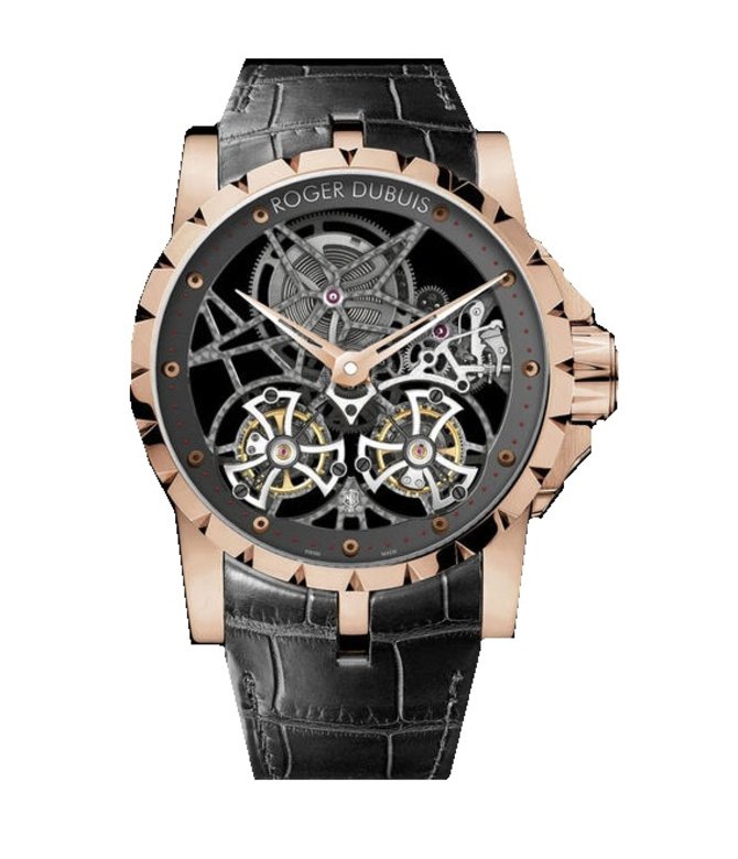 Мужские швейцарские часы в корпусе из розового золота, представленные часовым брендом Roger Dubuis. В корпусе, диаметром 45 миллиметров, расположен швейцарский механический мануфактурный механизм с двойным парящим турбийоном, разработанный компанией Roger Dubuis. Его в действие приводит ручной подзавод. Примечательно, что установленный в модели механизм отмечен двумя престижными сертификатами: 1) хронометра, выданный швейцарским институтом хронометрии COSC; 2) знаком качества "Poinçon de Genève" (Женевское Клеймо). Ремешок из крокодильей кожи с раскладной застежкой из розового золота поможет закрепить часы на руке. Герметичность корпуса, установленная производителем, составляет минимум 50 метров (5 атм.). Полностью скелетонизированный циферблат, на котором указываются часы и минуты, защищен сапфировым стеклом. Модель выпущена в 2009 году. Сама компания Roger Dubuis молода. Она была основана Роже Дюбуи и Карлосом Диасом в 1995 году. И Роже, и Карлос были очень близки к часовой индустрии. Роже Дюбуи трудился в легендарной мануфактуре Patek Philippe, а Карлос Диас был дизайнером у Franck Muller. Все часы марки Roger Dubuis, согласно мировым часовым традициям, выполняются вручную, от отделки механизма до декора корпуса.