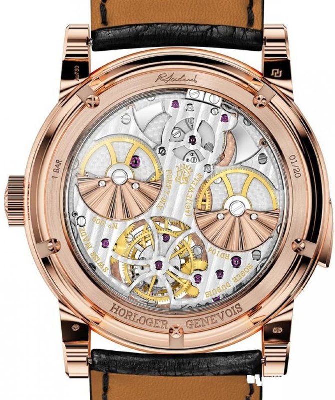 Швейцарские часы Roger Dubuis Hommage Minute Repeater Tourbillon Automatic - новинка 2014 года с корпусом, диаметр которого 45 мм, из розового золота. Роскошь сразу бросается в глаза благодаря циферблату из розового золота и стрелкам, приятно сочетаемыми с покрытыми золотом цветными местами часового механизма, который виднеется сквозь циферблат. Калибр RD104 состоит из 434 деталей. Часовой механизм имеет частоту 3 Гц и 60-ти часовой запас хода. Микро-роторы произведены из платины с покрытием из розового золота. Серия ограничена - 20 штук.