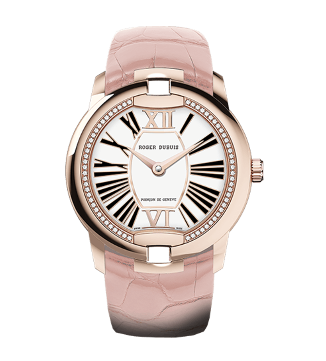 Корпус с эффектом тромплёй, выполненный из розового золота, инкрустирован белыми бриллиантами классической огранки, общим весом 0.24 карат. Внутри корпуса находится швейцарский мануфактурный механизм RD821 с автоматическим подзаводом. Механизм обладает 48-часовым запасом хода. Модель имеет клеймо качества Poinçon de Genève. Компания Roger Dubuis единственная, чьи часы отмечены этим знаком качества. Водостойкость корпуса - 30 метров. Ремень пошит из натуральной кожи крокодила. Застежка классическая, из розового золота.