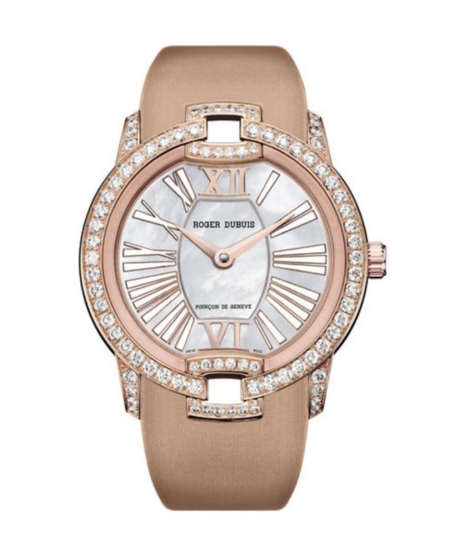 Женские ювелирные швейцарские часы в корпусе из розового 18-каратного золота, инкрустированном белыми бриллиантами. В корпусе, диаметром 36 миллиметров, поместился швейцарский механический мануфактурный механизм, разработанный компанией Roger Dubuis. Его в действие приводит автоматический подзавод. Примечательно, что данный механизм отмечен двумя престижными сертификатами: 1) хронометра, выданный швейцарским институтом хронометрии COSC; 2) знаком качества "Poinçon de Genève" (Женевское Клеймо). Тканевый ремешок с раскладной застежкой из розового золота поможет закрепить часы на руке. Герметичность корпуса, установленная производителем, составляет минимум 30 метров (3 атм.). Циферблат, на котором указываются часы и минуты, защищен сапфировым стеклом. Модель выпущена в 2012 году. Сама компания Roger Dubuis молода. Она была основана Роже Дюбуи и Карлосом Диасом в 1995 году. И Роже, и Карлос были очень близки к часовой индустрии. Роже Дюбуи трудился в легендарной мануфактуре Patek Philippe, а Карлос Диас был дизайнером у Franck Muller. Все часы марки Roger Dubuis, согласно мировым часовым традициям, выполняются вручную, от отделки механизма до декора корпуса.