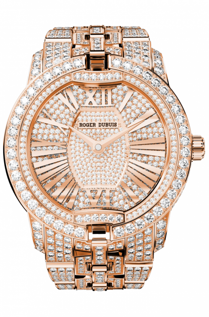Этот уникальный дует безукоризненной техники и наивысшей точности инкрустирован 1300 белыми бриллиантами классической огранки общим весом, приблизительно, 9 карат. Главным органом этих совершенных часов является автоматический механизм, калибр RD822. Изысканный элегантный дизайн корпуса красноречиво говорит о благородном происхождении. Яркое сверкание драгоценных камней обнимает всю часовую поверхность полностью - от центра циферблата до золотой раскладывающейся застежки. Компания Roger Dubuis показала уникальную производительность механизмов высшего уровня сложности. Она выпустила уйму автоматических калибров со классической индикацией часов, минут и секунд. Среди таких калибров и RD821. Не изменяя другим калибрам Roger Dubuis, этот автомеханизм тоже отмечен Женевским клеймом. Под сапфировым стеклом размещены золотистые удлиненные римские цифры. Ювелирные мастера компании ROGER DUBUIS посвятили этим часам весь собственный талант. Они кропотливо отбирали драгоценные камни, роскошно расположили бриллианты, сделав акцент на округлых формах, с целью максимально выделить плавность линий корпуса.