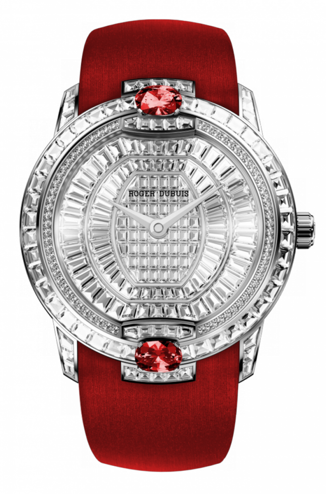 Много времени, сил и кропотливого труда отдал Роже Дюбуи для того, чтобы стать известным часовым мастером, чтобы добиться успеха в нелегком часовом деле. Он окончил Женевскую школу часовых мастеров в возрасте 20 лет и сразу приступил к первой работе. После этого получил 20-ти летний опыт работы в различных швейцарских часовых Домах. Это позволило ему, используя полученные знания, в 1980 году открыть маленькую мастерскую, специализирующуюся по ремонту и реставрации часов. Позже, благодаря судьбе, он попал в ателье часового мастера Карлоса Диаса. И уже в 1995 году Дюбуи и Диас приступили к изготовлению собственных эксклюзивных часовых произведений. Часы обладают почетным званием «Женевского клейма». Исключительно все детали швейцарских часов Roger Dubuis обрабатываются на собственных станках. Данная модель компании Roger Dubuis - часы Haute Joaillerie Velvet - новинка 2014 года. Она обладает механизмом RD821 с автоматическим заводом, 48-часовым запасом хода. Корпус данной модели, украшенный багетными и изумрудными бриллиантами и двумя красными сапфирами, выполнен из белого золота. Используется невидимый способ крепления бриллиантов. Механизм часов защищен сапфировым стеклом. Ремешок матерчатый, раскладывающаяся застежка выполнена из белого золота и украшена багетными бриллиантами. Водонепроницаемость часов до 30 метров.