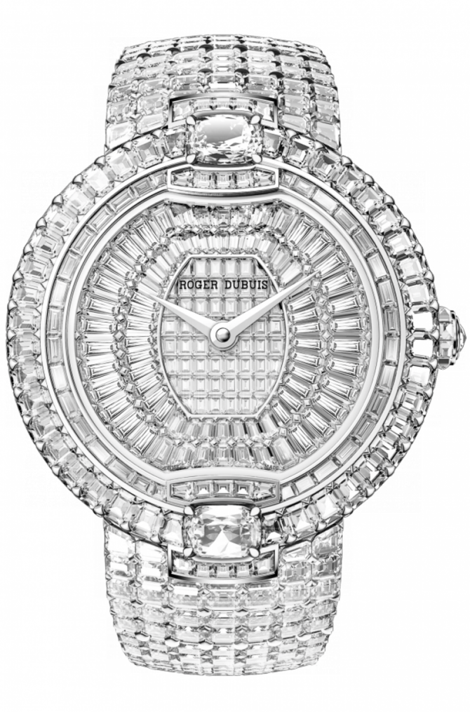 Часы обладают почетным званием «Женевского клейма». Исключительно все детали швейцарских часов Roger Dubuis обрабатываются на собственных станках. Данная модель компании Roger Dubuis - часы Velvet - новинка 2014 года. Она обладает механизмом RD821 с автоматическим заводом, 48-часовым запасом хода. Корпус данной модели, украшенный багетными и изумрудными бриллиантами, выполнен из платины. Используются разнообразные механизмы крепления бриллиантов: Clous de Paris, невидимая, глухая, канальная, крапановая, корнеровая. Механизм часов защищен сапфировым стеклом. Ремешок с раскладывающейся застежкой выполнен из платины и украшен бриллиантами изумрудной огранки. Водонепроницаемость - 30 метров. Много времени, сил и кропотливого труда отдал Роже Дюбуи для того, чтобы стать известным часовым мастером, чтобы добиться успеха в нелегком часовом деле. Он окончил Женевскую школу часовых мастеров в возрасте 20 лет и сразу приступил к первой работе. После этого получил 20-ти летний опыт работы в различных швейцарских часовых Домах. Это позволило ему, используя полученные знания, в 1980 году открыть маленькую мастерскую, специализирующуюся по ремонту и реставрации часов. Позже, благодаря судьбе, он попал в ателье часового мастера Карлоса Диаса. И уже в 1995 году Дюбуи и Диас приступили к изготовлению собственных эксклюзивных часовых произведений. Серия производства этой модели ограничена - всего 8 экземпляров.