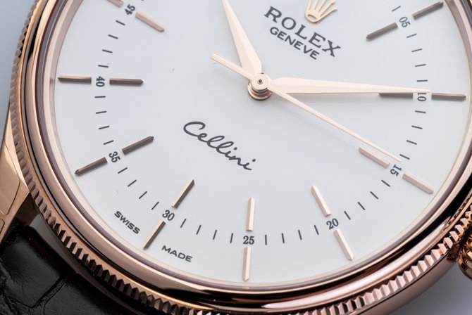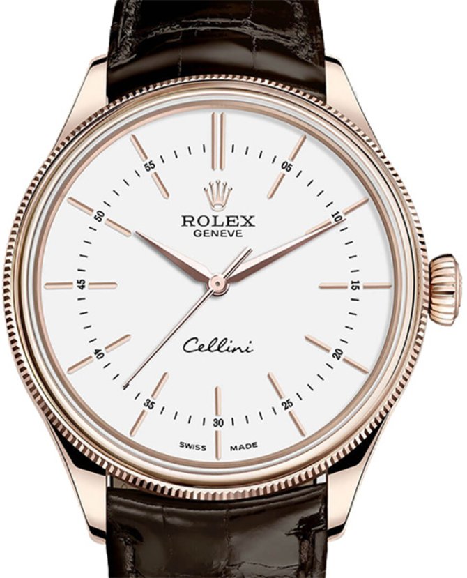 Классическая модель швейцарских наручных часов, разработанных легендарной компанией Rolex, представлена в круглом корпусе из мануфактурного золота под названием Everose - сплав розового золота, в который добавлен процент меди и платины. Этот сплав запатентован брендом Rolex. Безель рифленый. Белый циферблат служит для индикации, осуществляемой золотыми стрелками и метками, данных часов, минут и секунд. Модель Time Everose Gold, пополнившая ряды коллекции Cellini, выполняет функции на мануфактурном калибре Rolex Calibre 3132, имеющем сертификат хронометра. Запас хода механизма - 48 часов. Данную модель Rolex презентовали на выставке Baselworld в 2016 году. Циферблат защищает сапфировое стекло. Корпус с 39-миллиметровым диаметром герметичен до 50 метров. В комплекте - ремень из крокодиловой кожи коричневого цвета и классическая застежка из золота.