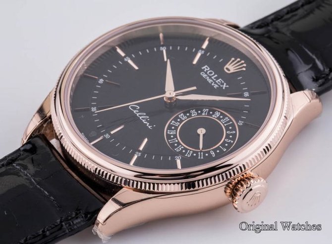 Модели Cellini Date имеют функцию «стрелочного календаря», сколь полезного, столь и элегантного. Все новые модели Cellini приводятся в движение высокоточным часовым механизмом с автоматическим подзаводом, получившим сертификат хронометра и полностью изготовленным Rolex. В чисто традиционном стиле их носят на браслетах из блестящей черной или коричневой кожи аллигатора, оснащенных раскладывающейся пряжкой из 18-каратного золота, чтобы можно было элегантно надеть свои часы, как истинный джентльмен. Модель Cellini Date предлагается в четырех вариациях: украшенная черным или серебряным гильошированным циферблатом «огненный луч славы» (Rayon flammé de la gloire) и заключенная, по желанию, в корпус из 18‑каратного золота или золота Everose с диаметром 39 мм. Часы носятся на браслете из блестящей кожи аллигатора с крупной чешуей черного или коричневого цвета, в зависимости от модели, с раскладывающейся пряжкой из 18‑каратного золота цвета корпуса.