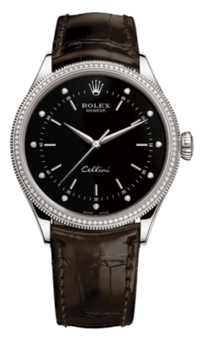 Перед Вами швейцарские наручные часы, представленные знаменитой и авторитетной маркой Rolex, специализирующейся на производстве качественных наручных часов класса люкс. Часы пополнили ряды коллекции Cellini. 39-миллиметровый корпус произведен из белого золота. В него помещен механизм с автоматическим подзаводом, калибр 3132. Запас хода - 48 часов. Также отметим, что установленный часовой калибр был отмечен COSC статусом хронометра как сверхточный механизм. Черный циферблат отображает часы, минуты и секунды с помощью золотых стрелок. Выше часовых меток установлены небольшие бриллианты классической огранки. Водонепроницаемость золотого корпуса - 50 метров. В комплекте - крокодиловый ремешок с классической пряжкой из белого золота.
