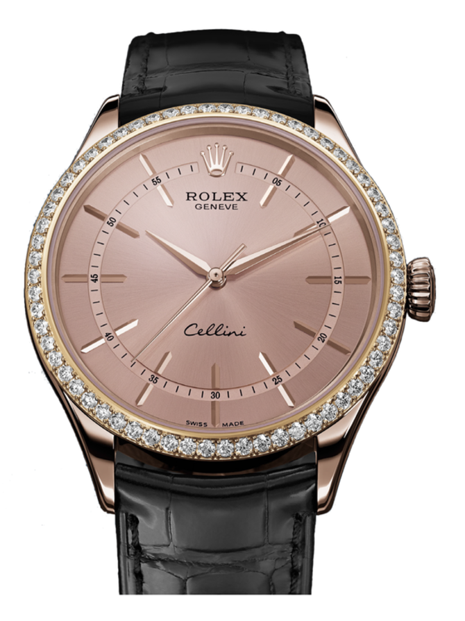 Швейцарские часы Cellini Time 50705rbr-0010 изготовлены из чистого полированного 18-каратного розового золота, диаметром 39 мм. Золотой безель, украшенный белыми классическими бриллиантами, удачно сочетается с золотисто-желтым циферблатом. Часы оснащены ремешком из натуральной коричневой кожи аллигатора с классической пряжкой из золота. На циферблате были размещены стрелки и метки часов для индикации часов, минут, секунд. Защитное стекло выполнено из сапфирового кристалла с нанесением на него противобликового покрытия. Калибр 3132 с автоматическим подзаводом, 48-часовым запасом хода и наличием сертификата хронометра, который был выдан Rolex швейцарским институтом хронометрии COSC. Водонепроницаемость золотого полированного корпуса - 50 метров.