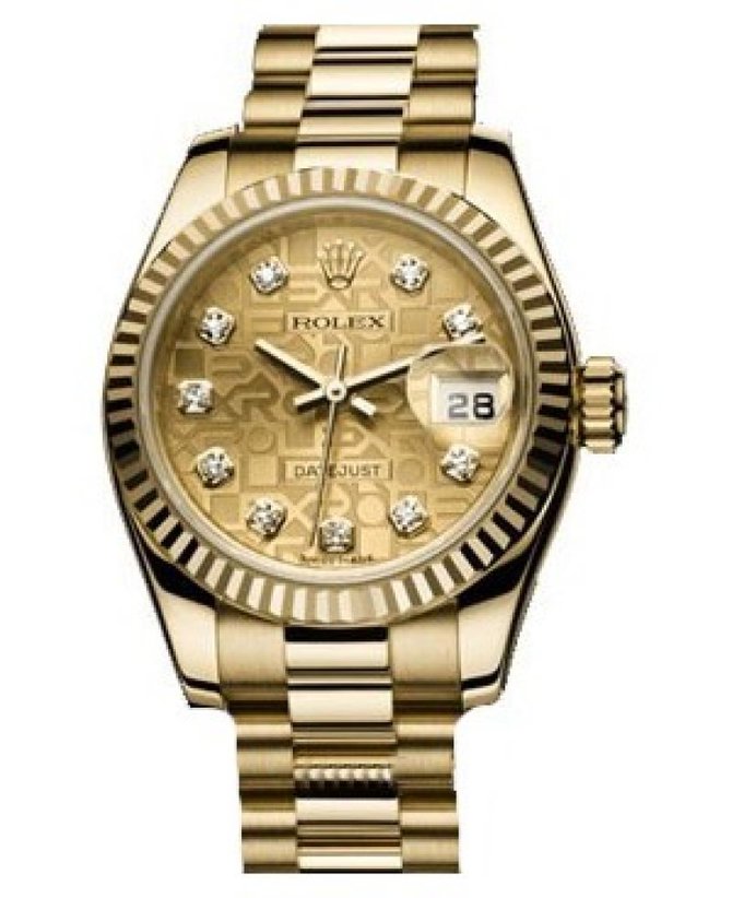 Rolex Lady-Datejust Datejust Lady - President Yellow Gold - Fluted Bezel ref. 179178 champagne jubilee dial diamond. Хронометр - сертификация COSC. Браслет - President с застежкой Crownclasp. Циферблат - цвет шампанского, дизайн Jubilee, инкрустирован 10 белыми бриллиантами.