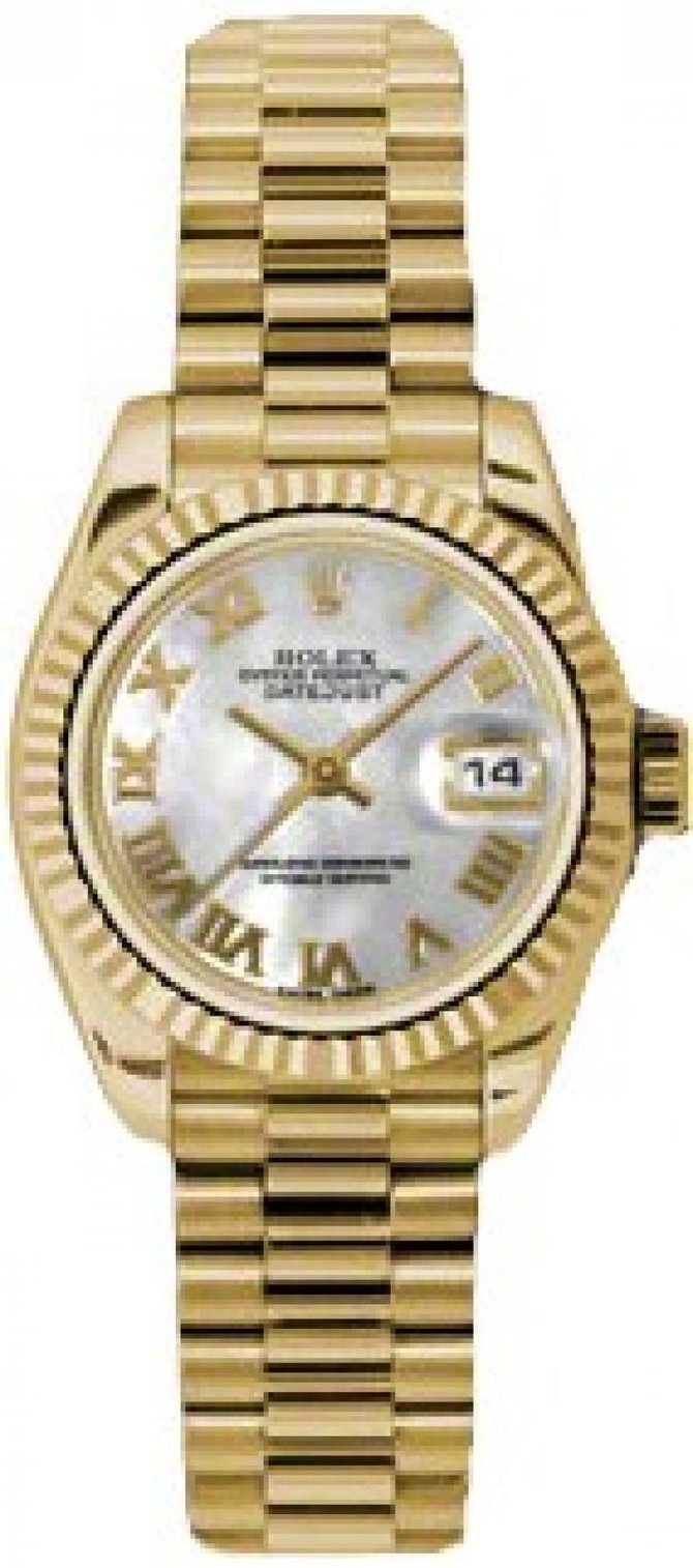 Часы Rolex - Леди Datejust - Золотой Президент желтого золота - Рифленый диск - Президент№ модели: 179178 mrp Rolex Oyster Perpetual Lady-Datejust Watch. 26мм 18-каратного желтого золота. Рифленый циферблат серебристого цвета. Браслет из желтого золота 18к.