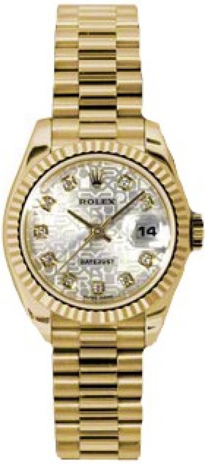 Часы Rolex - Леди Datejust - Золотой Президент желтого золота - Рифленый диск - Президент№ модели: 179178 sjdp Rolex Oyster Perpetual Lady-Datejust Watch. 26мм 18-каратного желтого золота. На рифленом циферблате серебристого цвета, 10 белых бриллиантов. Браслет из желтого золота 18к.