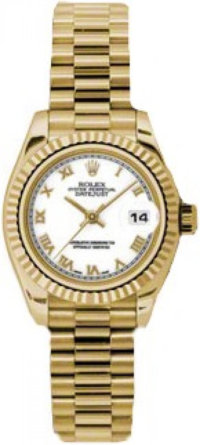 Часы Rolex - Леди Datejust - Золотой Президент желтого золота - Рифленый диск - Президент№ модели: 179178 wrp Rolex Oyster Perpetual Lady-Datejust Watch. 26мм 18-каратного желтого золота.. Рифленый циферблат белого. Браслет из желтого золота 18к.