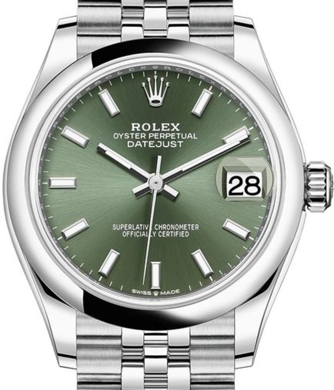 Женские швейцарские наручные часы Datejust 31 Jubilee Perpetual 31 mm Ref. 278240-0012 часовая мануфактура выпустила в 2020 году. Инженеры марки Rolex в круглый корпус из нержавеющей стали установили собственную мануфактурную разработку - калибр 2236 с автоматическим подзаводом и запасом хода на 55 часов работы. Также стоит отметить наличие сертификата хронометрической точности хода от COSC. Диаметр корпуса - 31 мм. Циферблат с сатинированной отделкой зеленого цвета служит для индикации текущего времени. Часовая разметка и стрелки покрыты люминесцентным составом белого цвета. Над индикатором даты установлена специальная циклопная линза для увеличения показаний. Браслет из нержавеющей стали оснащен раскладной пряжкой. Корпус отличается высокой герметичностью - 100 метров.