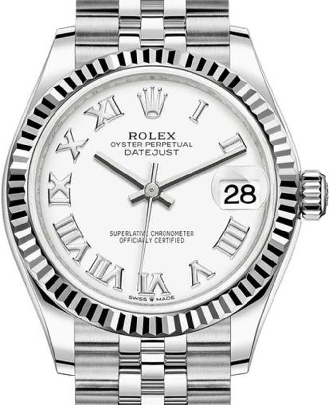Швейцарские часы для женщин Datejust 31 Jubilee Perpetual 31mm Ref. 278274-0010 часовая мануфактура Rolex выпустила в 2020 году. Инженеры марки Rolex в круглый корпус из белого золота и нержавеющей стали установили собственную мануфактурную разработку - калибр 2236 с автоматическим подзаводом и запасом хода на 55 часов работы. Также стоит отметить наличие сертификата хронометрической точности хода от COSC. Диаметр корпуса - 31 мм. Белый циферблат служит для индикации текущего времени. Выше индикатора даты установлена специальная циклопная линза для увеличения показаний. Браслет из нержавеющей стали оснащен раскладной пряжкой. Корпус отличается высокой герметичностью - 100 метров.