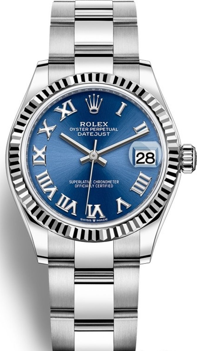 Наручные часы для женщин Datejust 31mm Steel and White Gold 278274-0033 часовой бренд Rolex выпустил в комбинированном корпусе из нержавеющей стали и белого золота, диаметром 31 мм. На руке часы крепятся фирменным браслетом с раскладной застежкой из нержавеющей стали и белого золота. На сатинированном синем циферблате указываются часы, минуты, секунды, дата. Часовые метки со стрелками произведены из стали. Индикатор даты накрыт циклопной линзой, что способствует увеличению показаний. Запас хода мануфактурного механизма 2236 от Rolex с автоматическим подзаводом рассчитан на 55 часов. Водонепроницаемость корпуса - 100 метров. Циферблат накрыт стеклом из натурального сапфирового кристалла.