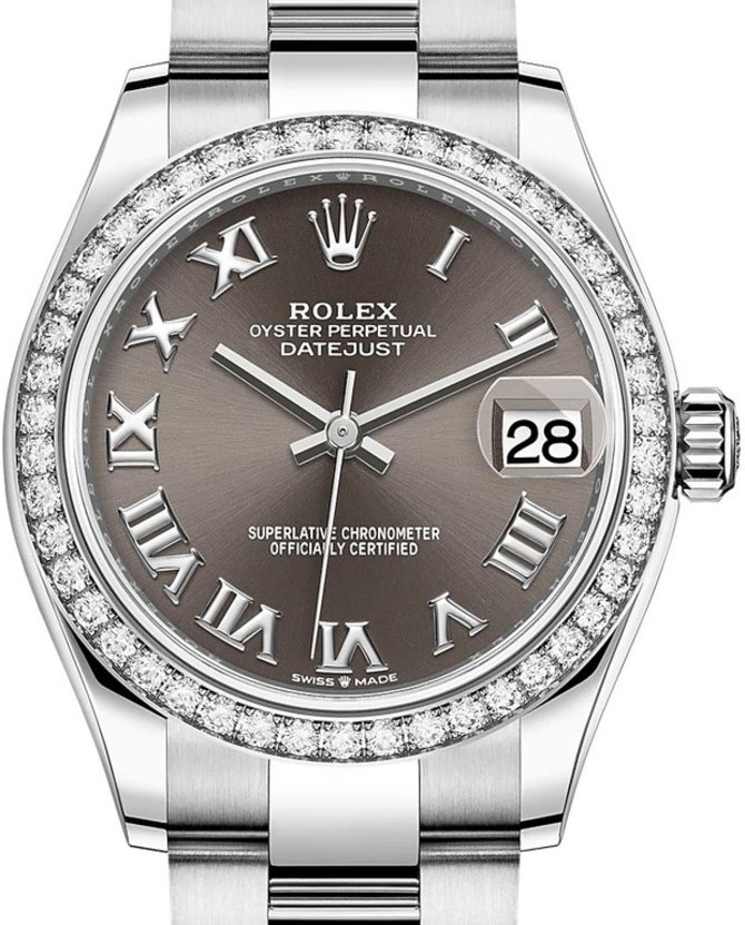 Компания ROLEX представила механическую ювелирную модель наручных часов для женщин Datejust 31 Oyster Perpetual 31 mm Ref. 278384RBR-0025 в 31-миллиметровом корпусе из белого 18-каратного золота и нержавеющей стали. Год выпуска модели - 2020. Коричневый сатинированный циферблат оснащен римскими часовыми метками и стрелками для индикации времени, а также индикатором даты с фирменной циклопной линзой сверху для увеличения показаний. Циферблат защищает сапфировое стекло с противобликовыми свойствами. На руке часы фиксируются стальным браслетом с раскладной застежкой. Безель инкрустирован бриллиантами классической огранки белого цвета. Водонепроницаемость корпуса рассчитана на 100 метров. Модель оснащена механизмом 2236, что отличается автоподзаводом и запасом хода на 55 часов работы. Высокая точность хода гарантирована сертификатом хронометра COSC.