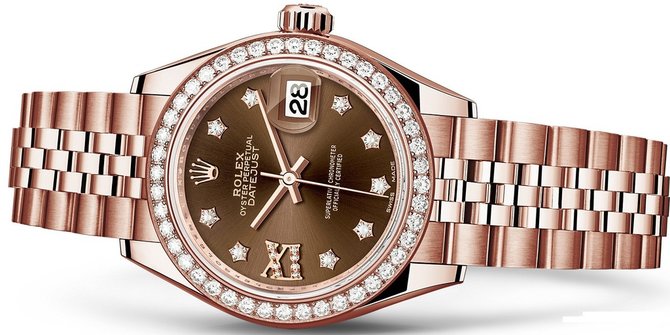 Rolex Lady-Datejust - это швейцарские часы, которые отличаются разнообразием моделей. Аксессуар выполнен из мануфактурного 18-каратного розового золота Everose. Цельный корпус из 18-каратного розового золота обеспечивает водонепроницаемость до 100 м. Безель инкрустирован сияющими бриллиантами. Неповторимый стиль создают различные оттенки циферблатов и богатая гамма материалов. Коричневый циферблат обеспечивает отличную читаемость показаний. Отметки на циферблате выполнены из белых бриллиантов. Центральные стрелки изготовлены из розового золота. В окошко индикации даты помещена циклопная линза с увеличением для удобного считывания показаний. Дата устанавливается мгновенно. Для выставления точного времени есть возможность остановки секундной стрелки. Автоматический калибр 2236 с запасом хода 55 часов полностью изготовлен в компании Rolex, что гарантирует высокое качество данной модели. Калибр 2236 имеет сертификат Швейцарского хронометра, выданный Официальным швейцарским институтом хронометрии (COSC). К модели прилагается пятирядный браслет из 18-каратного розового золота. Скрытая застежка с раскладывающейся пряжкой доводит до совершенства эстетику и функциональность этих роскошных часов.