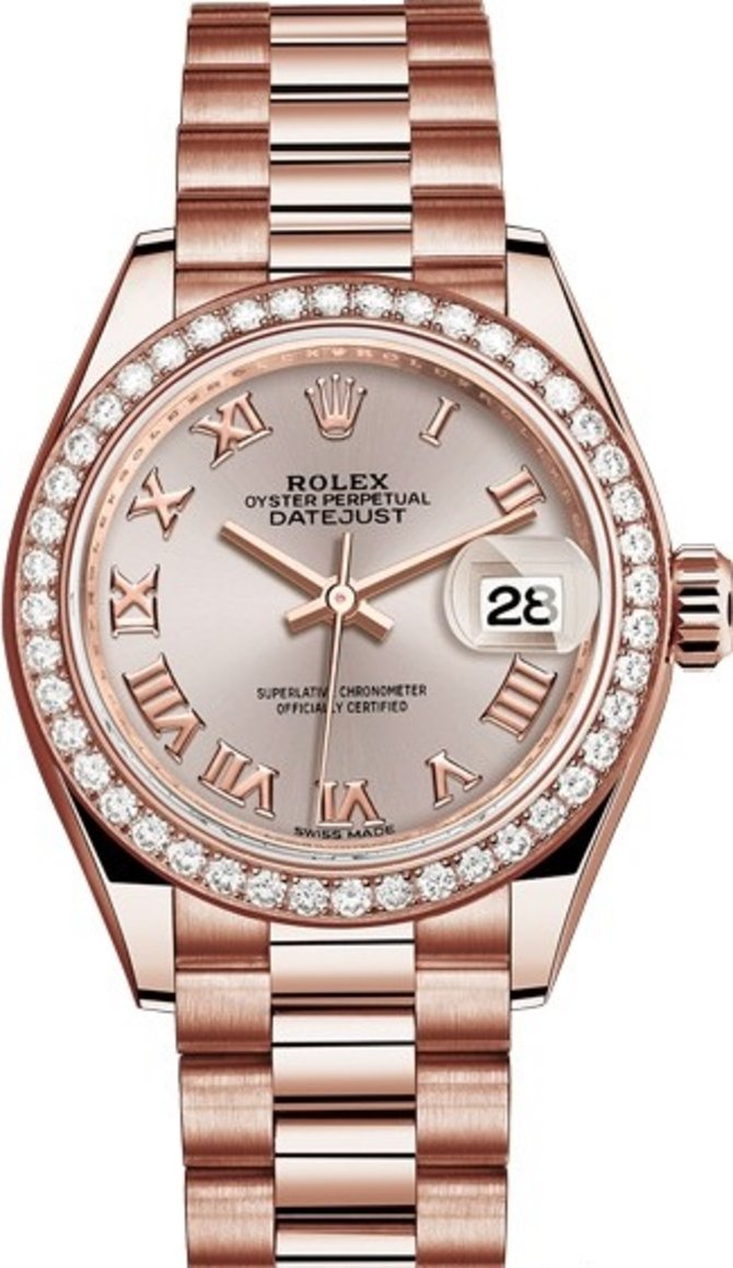 Модель Lady-Datejust от швейцарской фирмы Rolex, благодаря дизайнерскому мастерству, имеет стильный и изящный вид. Это безукоризненно надежный хронограф. Модель оснащена механизмом от Rolex калибр 2236. Мануфактурный калибр получил сертификат Швейцарского хронометра, который выдан Официальным швейцарским институтом хронометрии (COSC). Для проверки показателей точности хода часов в процессе эксплуатации компания Rolex ещё тестирует часы в собранном виде, что позволяет гарантировать их исключительные характеристки в ходе ношения: точность, водонепроницаемость до 100 м, автоподзавод, запас хода 55 часов. Корпус часов выполнен из 18-каратного розового золота. Everose Gold - это эксклюзивный сплав, запатентованный Rolex, который обладает неповторимым розовым цветом. Особенный состав сплава позволяет сохранять розовый цвет долгое время. На серебристом циферблате расположены золотые часовые индексы, часовая, минутная и секундная стрелки, окошко индикации даты с циклопной линзой. Белые бриллианты, расположенные на безеле, излучают интенсивное сияние. Циферблат защищает сапфировое стекло. Комплектуются часы браслетом из 18-каратного розового золота со скрытой застежкой.