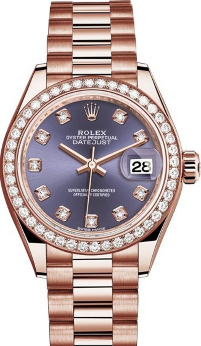 Швейцарские часы Rolex Lady-Datejust, выполненные в классическом стиле, имеют ряд усовершенствований. Корпус модели Lady-Datejust выполнен из 18-каратного розового золота, завораживающего своим блеском. Мануфактурный механизм Rolex 2236 с функцией автоматического подзавода и запасом хода 55 часов сертифицирован Официальным швейцарским институтом хронометрии (COSC). Данный механизм включает кремниевую спираль, запатентованную компанией Rolex. Такая особенность обеспечивает оптимальную защиту хронометра от магнитного воздействия, от удара вслествие падения, от изменения температуры окружающей среды. Применение высококачественных материалов при изготовлении корпуса и механизма обеспечивает точность и солидный срок службы часов Rolex. Полная водонепроницаемость до 100 м. Синий циферблат защищен сапфировым стеклом. Особую красоту часам придают белые бриллианты, которые расположены на циферблате и безеле. Традиционно модель обладает функциями индикации секунд, минут и часов. На отметке 3 часа расположено окошко индикации даты с циклопной линзой, обеспечивающей наилучшую читаемость показаний. Часы комплектуются удобным браслетом из 18-каратного розового золота, дополненным усовершенствованной регулировкой удлиняющего звена.