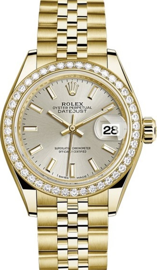 Элегантные и стильные швейцарские часы Rolex Lady-Datejust выполнены в классическом стиле с новыми дизайнерскими идеями. Модель имеет корпус из 18-каратного желтого золота с инкрустированным сияющими бриллиантами безелем. Корпус данной модели обеспечивает полную защиту механизма с автоподзаводом и запасом хода 55 часов. Хронометр Rolex Lady-Datejust с калибром 2236 получил сертификат Швейцарского хронометра, который выдан Официальным швейцарским институтом хронометрии (COSC), тем самым подтверждая высокую точность и качество автоматического механизма. На глубине до 100 м модель Lady-Datejust полностью водонепроницаема. Традиционно часы обладают функциями индикации секунд, минут и часов, которые осуществляются с помощью центральных золотых стрелок на серебристом циферблате. На трех часах в квадратной апертуре помещен цифровой счетчик даты с увеличительной линзой. Циферблат защищен прочным сапфировым стеклом. Дополняет облик хронометра удобный гибкий пятирядный браслет из 18-каратного желтого золота.