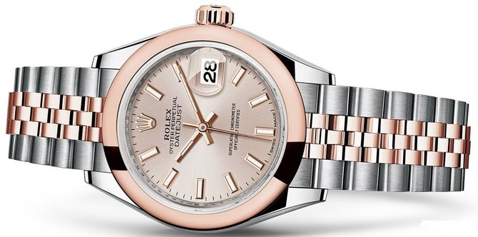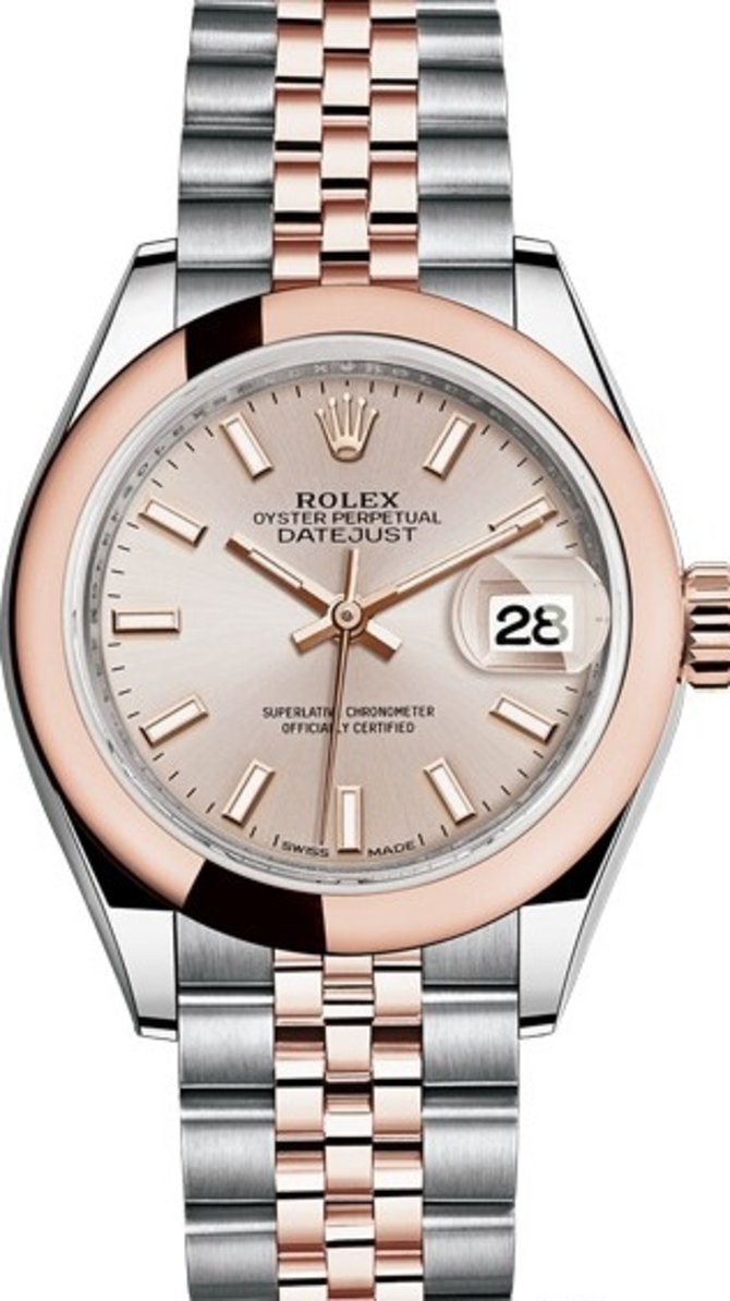 Модель швейцарских часов Rolex Lady-Datejust - это образец универсального классического стиля . В ней традиционно сохранены функции часов, минут, секунд и индикатор даты. Эти основные эстетические принципы обеспечивают узнаваемость и признание швейцарских часов Rolex. Корпус модели выполнен в биметаллическом исполнении - это сочетание нержавеющей стали и 18-каратного розового золота. На серебристом циферблате расположены часовые отметки и центральные стрелки, изготовленные из розового золота. Дата показана в окошке на циферблате в положении "3 часа". Ровно в полночь дата мгновенно меняется. Для удобного считывания информации к обычному стеклу добавлена циклопная линза, увеличивающая размер показаний даты. Циферблат защищен сапфировым стеклом. Модель оснащена механизмом нового поколения с автоподзаводом и запасом хода 55 часов. Калибр 2236 производства Rolex успешно прошел тестирование в Официальном швейцарском институте хронометрии (COSC). Корпус обеспечивает полную защиту механизму и гарантирует водонепроницаемость до 100 м. Часы комплектуются комбинированным пятирядным браслетом, крайние звенья которого изготовлены из нержавеющей стали, центральные звенья - из 18-каратного розового золота.