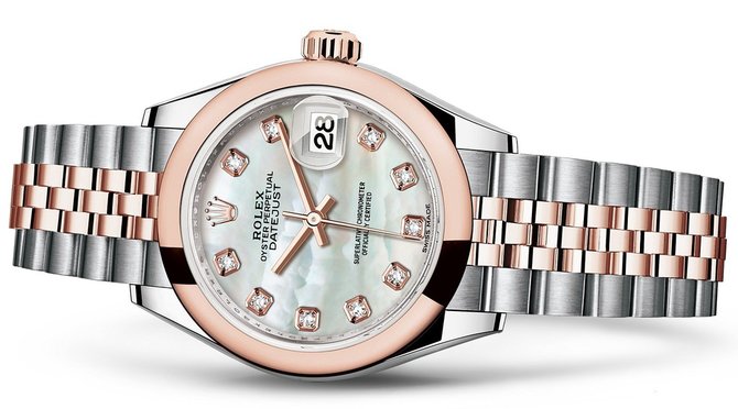 Швейцарские часы Rolex Lady-Datejust относятся к разряду высокоточных. Оснащены механизмом от Rolex калибр 2236, который прошел тестирование и получил сертификат Швейцарской Службы официального контроля за хронометрами (COSC). Компания Rolex тестирует также часы в собранном виде, что позволяет гарантировать в ходе ношения следующие характеристики: высокую точность, автоматический подзавод, водонепроницаемость до 100 м и запас хода 55 часов. Корпус модели Lady-Datejust является эталоном прочности и надежности. Корпусное кольцо изготовлено из цельного блока нержавеющей стали, которая имеет превосходные антикоррозийные свойства. Заводная головка, безель и средние звенья браслета выполнены из 18-каратного розового золота. Жемчужный белый циферблат украшают белые бриллиантовые часовые индексы. Камни инкрустируются по всем правилам ювелирного искусства и славятся великолепным качеством. Функции индикации секунд, минут, часов выполняют центральные стрелки. Одна из характерных особенностей часов Rolex - это очень плавное движение секундной стрелки. Над апертурой даты находится циклопная линза. Защищает циферблат от внешнего воздействия сапфировое стекло. Часы комплектуются комбинированным браслетом из нержавеющей стали и 18-каратного розового золота.
