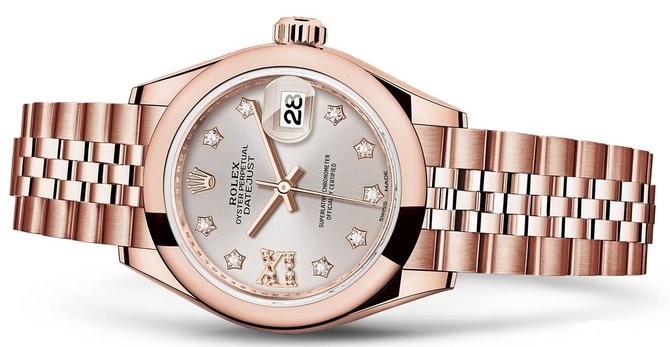Часы Rolex Lady-Datejust имеют великолепные технические характеристики и неповторимый швейцарский лоск. Благодаря высокой точности данная модель швейцарских часов Rolex официально получила сертификат хронометров COSC. Корпус из 18-каратного розового золота скрывает высокоточный механизм калибр 2236 и обеспечивает водонепроницаемость до 100 м. Механизм имеет запас хода 55 часов. Сапфировое стекло защищает серебристый циферблат, накладные индексы времени из белых бриллиантов в золотой оправе и три центральные стрелки, изготовленные из 18-каратного розового золота. Одна из главных особенностей часов Rolex Lady-Datejust заключается в том, что секундная стрелка движется очень плавно. Данная модель часов выпускается на фирменном браслете из 18-каратного розового золота, что придает ей особую изысканность.