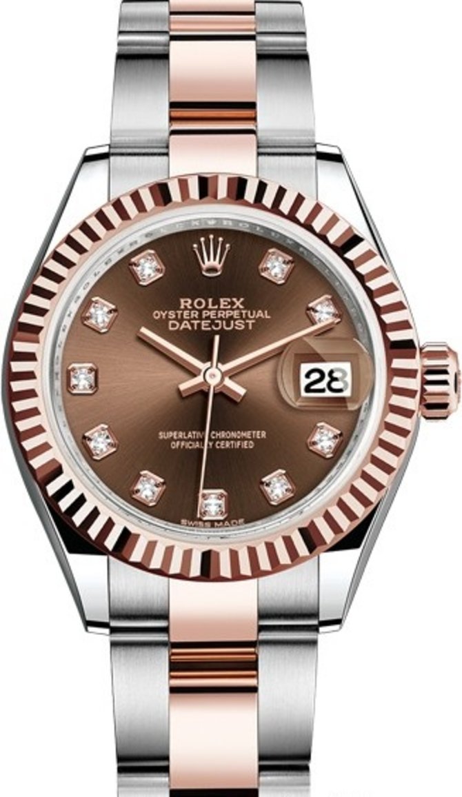 Роскошные швейцарские часы Rolex Lady-Datejust выполнены в классическом стиле с интересными дизайнерскими дополнениями. Модель Lady-Datejust имеет великолепные технические характеристики. Часы имеют мануфактурный механизм 2236 от Rolex с автоматическим подзаводом. Запас хода 55 часов. Этот механизм отмечен сертификатом Швейцарского хронометра, который выдан Официальным швейцарским институтом хронометрии (COSC). Механизм надежно защищен комбинированным корпусом из нержавеющей стали и 18-каратного розового золота. Корпус часов обеспечивает водонепроницаемость до 100 м. Коричневый циферблат украшают 10 сияющих бриллиантов. У модели имеется стандартная функция часов, минут и секунд. Очень плавное движение секундной стрелки - одна из характерных особенностей часов Rolex. Центральные стрелки выполнены из розового золота. Циклопная линза на окошке индикации даты обеспечивает наилучшую читаемость показаний. На отметке 12-ти часов циферблат украшает золотая эмблема мануфактуры Rolex. Циферблат защищен сапфировым стеклом. Модель часов Rolex Lady-Datejust выпускается в комплекте с удобным и гибким трехрядным комбинированным браслетом из нержавеющей стали и 18-каратного розового золота.