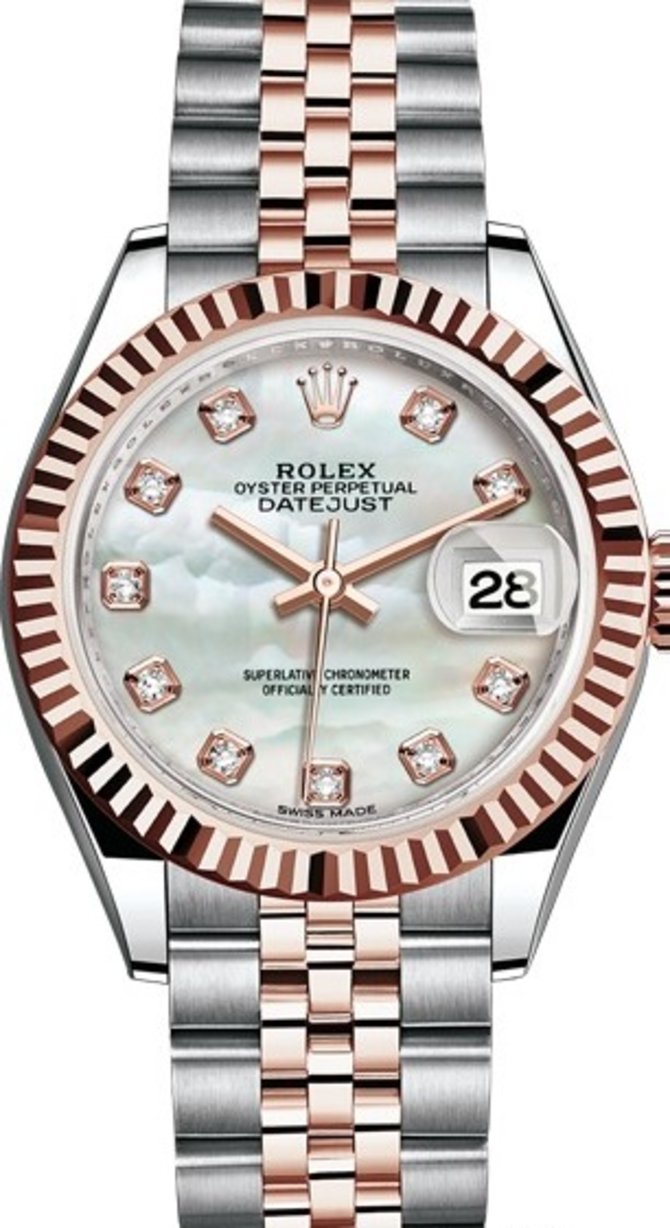 Швейцарские часы Lady-Datejust - это новое поколение классических часов Rolex с обновленным дизайном корпуса и циферблата. Данная модель часов оснащена новым калибром Rolex 2236. Этот механизм с функцией автоматического подзавода отмечен сертификатом Швейцарского хронометра, который выдан Официальным швейцарским институтом хронометрии (COSC). Механизм обеспечивает запас хода 55 часов. Визитная карточка часов Rolex - это соединение двух металлов в одной модели. Корпус изготовлен из нержавеющей стали и 18-каратного розового золота. Он обеспечивает абсолютную водонепроницаемость до 100 м. На отметке 3 часов присутствует индикатор даты, покрытый циклопной линзой, что обеспечивает наилучшую читаемость показаний. Такая особенность делает часы Rolex одними из самых известных и узнаваемых в мире. Циферблат белый перламутровый. Rolex не использует искусственное окрашивание перламутра. Поэтому каждый перламутровый циферблат уникален. Часовые отметки из белых бриллантов, секундная, минутная и часовая стрелки, выполненные из розового золота, подчеркивают элегантность и женственность этой модели. Часы комплектуются удобным гибким пятирядным браслетом из нержавеющей стали и 18-каратного розового золота со скрытой застежкой и раскладывающейся пряжкой.