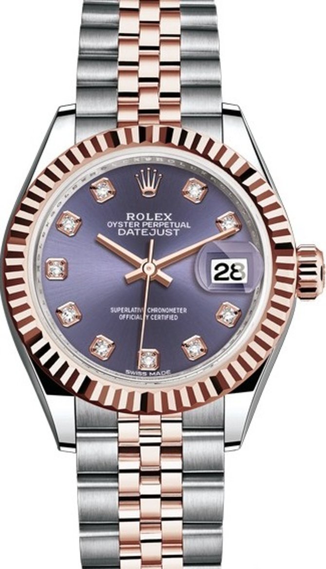 Rolex Lady-Datejust - это элегантные миниатюрные швейцарские часы, достойные украшать женское запястье. Корпус часов изготовлен из нержавейющей стали и 18-каратного розового золота. Сталь - это прочность и надежность. Золото - это металл, который ценится за благородный блеск. Сочетание этих металлов - это фирменная особенность Rolex, позволяющая часам сохранить работоспособность и первоначальную красоту даже в экстремальных условиях эксплуатации. Корпус надежно защищает механизм часов и обеспечивает водонепроницаемость до 100 м. Калибр 2236 - это механизм с автоматическим подзаводом и индикацией даты. Запас хода 55 часов. Циферблат синий. Украшен 10 белыми бриллиантами. Защищает циферблат сапфировое стекло. Отличительная особенность швейцарских часов Rolex Lady-Datejust - это циклопная линза над апертурой даты, увеличивающая изображение в 2,5 раза. Браслет, выполненный из нержавеющей стали и розового золота, оснащен незаметным креплением под безелем. Это создает впечатление единства браслета и корпуса.