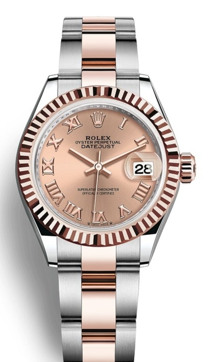 Женские наручные часы Datejust 28 mm Steel and Everose Gold 279171-0027 компания Rolex выпустила в комбинированном корпусе из розового золота и нержавеющей стали в диаметре 28 мм с комбинированным браслетом и раскладной застежкой. На золотистом циферблате указываются часы, минуты, секунды, дата. Индикатор даты накрыт циклопной линзой. Запас хода мануфактурного механизма 2236 от Rolex с автоматическим подзаводом рассчитан на 55 часов. Официальный швейцарский институт хронометрии COSC отметил установленный в этих часах механизм сертификатом хронометра. Корпус герметичен до 100 метров. Циферблат закрыт сверхпрочным стеклом из натурального сапфирового кристалла.