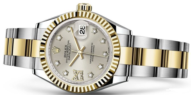 Стильная модель швейцарских часов Lady-Datejust выполнена в классическом стиле Rolex с интересными дополнениями в неизменно высоком качестве. Часы имеют великолепные технические характеристики и неповторимый швейцарский лоск. Благодаря высокой точности модель официально получила сертификат хронометров COSC. Модель Lady-Datejust оснащена мануфактурным калибром 2236. Это механизм нового поколения с функцией автоматического подзавода и запасом хода 55 часов. Корпус часов изготовлен из нержавеющей стали, 18-каратного желтого золота и обеспечивает водонепроницаемость до 100 м. Циферблат серебристый. У модели имеется стандартная функция часов, минут и секунд. Часовые отметки выполнены из белых сияющих бриллиантов, стрелки - из желтого золота. На трех часах размещен цифровой указатель текущей даты, закрытый увеличительным стеклом. Циферблат защищен сапфировым стеклом, которое устойчиво к появлению царапин. Это помогает часам сохранить презентабельный внешний вид. Часы комплектуются комбинированным браслетом из трехрядных звеньев со скрытой застежкой. Боковые звенья браслета изготовлены из нержавеющей стали, а центральные звенья - из 18-каратного желтого золота.