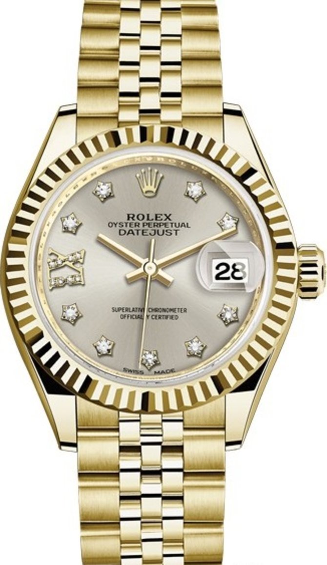 Швейцарские часы Lady-Datejust - это образец женской классики Rolex, воплощение стиля и последних технических разработок. Модель Rolex Lady-Datejust - это высокоточные механические часы с автоподзаводом и запасом хода 55 часов. Высокую точность хода часов обеспечивает механизм, раскручивающий заводную пружину равномерно. Калибр 2236 - это механизм нового поколения, который разработан и изготовлен Rolex, имеет сертификат швейцарской Службы официального контроля за хронометрами (COSC). Корпус часов выполнен из 18-каратного желтого золота и обеспечивает водонепроницаемость до 100 м. На серебристом циферблате секундная, минутная и часовая стрелки изготовлены из желтого золота, а часовые отметки украшают белые бриллианты. Еще одна особенность часов Rolex Lady-Datejust - это циклопная линза с увеличением в окошке индикации даты для удобного считывания информации. Циферблат покрыт сапфировым стеклом. К модели прилагается браслет из 18-каратного желтого золота с незаметным креплением, что обеспечивает единство браслета и корпуса часов.