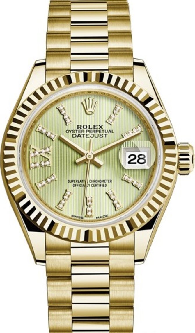 Швейцарские часы Lady-Datejust - это образец женской классики Rolex, воплощение стиля и последних технических разработок. Корпус часов выполнен из 18-каратного желтого золота. Это благородный драгоценный металл, который завораживает своим блеском. Корпус данной модели часов гарантирует водонепроницаемость до 100 м и надежно защищает находящийся в нем сверхточный механизм с функцией автоматического подзавода. Запас хода 55 часов. Зеленый гильошированный циферблат украшают белые бриллианты на часовых отметках. Секундная, минутная и часовая стрелки выполнены из 18-каратного желтого золота. Отличительная особенность швейцарских часов Rolex Lady-Datejust - это циклопная линза над апертурой даты, увеличивающая изображение в 2,5 раза. Защищает циферблат сапфировое стекло. Часы комплектуются гибким и удобным браслетом из 18-каратного желтого золота.