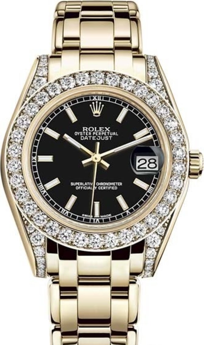 Инкрустированный белыми бриллиантами классической огранки корпус из желтого 18-каратного золота внутри себя надежно хранит автоматический мануфактурный часовой механизм с 48 часовым запасом хода и сертификатом хронометра от COSC - швейцарского института хронометрии. Этот факт подтверждает и надпись "Superlative Chronometer Officially Certified", нанесенная на циферблат и выгравированная на задней крышке корпуса. Ювелирные швейцарские элегантные наручные часы Rolex Pearlmaster Pearlmaster Yellow Gold 34 mm 81158-0117 идеально украсят запястье владелицы, а также станут незаменимым помощником на каждый день. На черном циферблате сатинированного типа показываются часы, минуты, секунды, дата. Метки и стрелки выполнены из золота и покрыты люминесцентным покрытием.