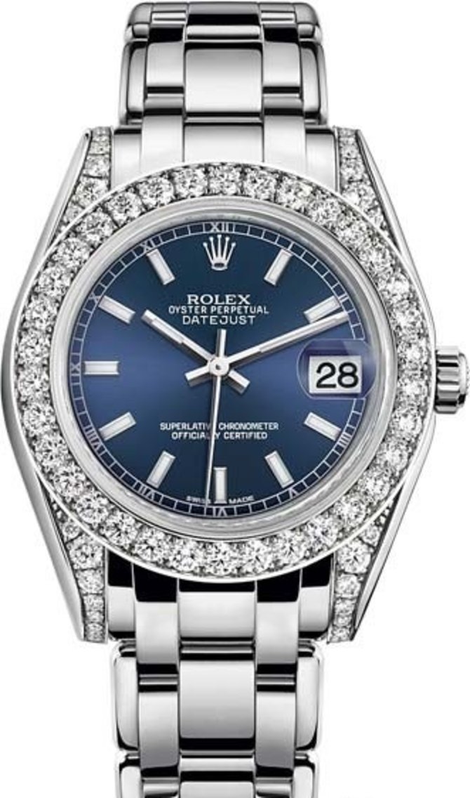 Модель швейцарских часов Pearlmaster White Gold 34 mm 81159-0052 от компании Rolex - это настоящая находка для ценителей высокого качества и хронометрической точности хода. Часы укомплектованы автоматическим механизмом 2235 с запасом хода на 48 часов. Кроме того, калибр 2235 был отмечен СOSC как сверхточный хронометр. Об этом свидетельствует сертификат. Дизайн модели разработан в сочетании современности с классикой. Корпус изготовлен из белого золота. Его водонепроницаемость составляет 100 метров. На сатинированном циферблате синего цвета установлены часовые индексы и стрелки из белого золота с покрытием люминесцентным составом. Индикатор даты оснащен специальной линзой для увеличения показаний. Сапфировое стекло обеспечивает защиту циферблату от повреждений разного характера. Часы комплектуются прочным браслетом из белого золота. Корпус инкрустирован бриллиантами.