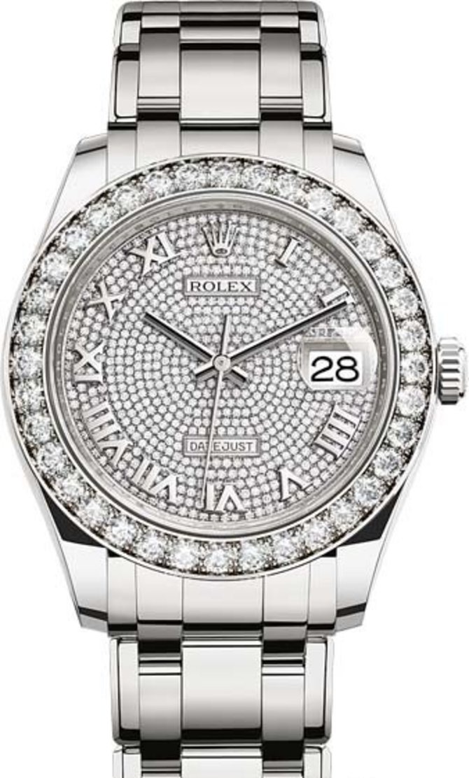 Ювелирная модель наручных швейцарских часов Pearlmaster White Gold 34 mm 86289-0005 от швейцарского бренда Rolex, созданного еще в 1905 году, - пополнение коллекции "DateJust Ladies". Знаковые часы в 34-миллиметровом корпусе из 18-каратного белого золота имеют блестящий дизайн благодаря украшению бриллиантами циферблата и корпуса часов. Браслет с раскладывающейся застежкой в комплекте выполнены из белого 18-каратного золота. Стекло изготовлено из натурального высокопрочного сапфирового кристалла с противобликовым покрытием. Весь циферблат декорирован с помощью натуральных бриллиантов. Корпус обладает герметичностью до 100 метров глубины. Механизм часов имеет престижный сертификат хронометра от COSC. Циклопная линза накрывает индикатор даты для увеличения его показаний.
