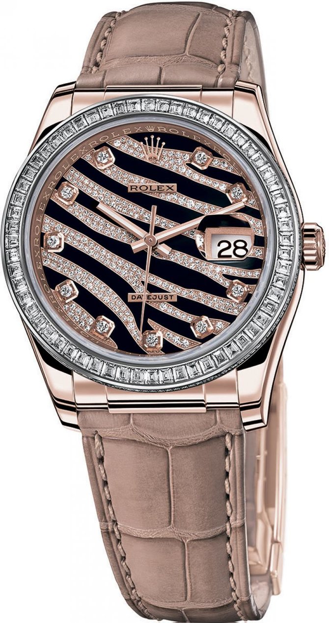 Часы Datejust из золота Everose воспевают бриллианты и ювелирное искусство. Циферблат из розового золота этой модели Datejust соединяет в себе современное черное лаковое покрытие и 262 вставленных в оправу бриллианта, поражая своим контрастом. Десять бриллиантов в оправке из розового золота на часовых отметках поражают удивительным сиянием.Безель украшен драгоценными камнями, демонстрируя 60 бриллиантов прямоугольной огранки, соответствующих каждой секунде, и 120 изящно оправленных алмазов бриллиантовой огранки.