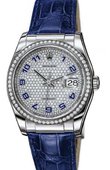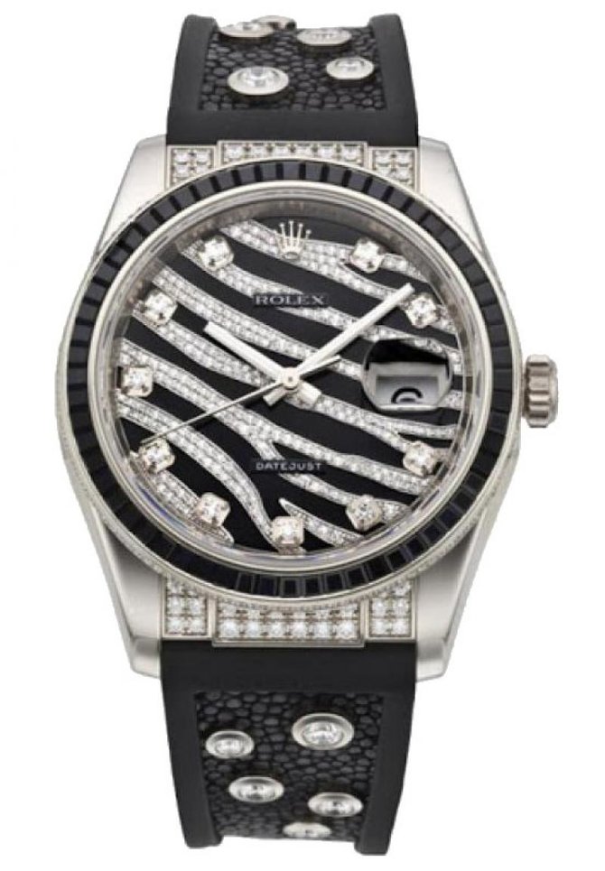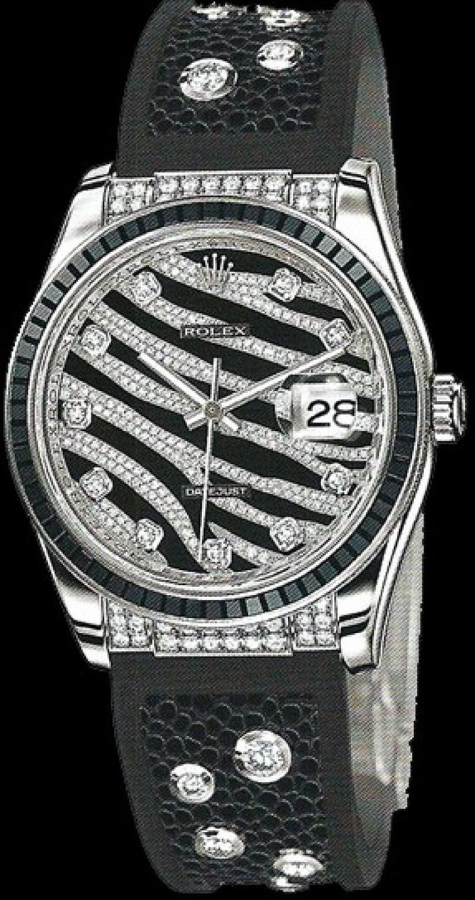 Корпус диаметром 36 мм из белого золота,с безелем из черных сапфиров багетной огранки. Сапфировое стекло с лупой над апертурой даты и традиционная водостойкость в 100 метров. Механизм, по-прежнему с 1988 года, калибр 3135, с запасом хода 48 часов, 31 камнем, сертифицированный хронометр COSC.