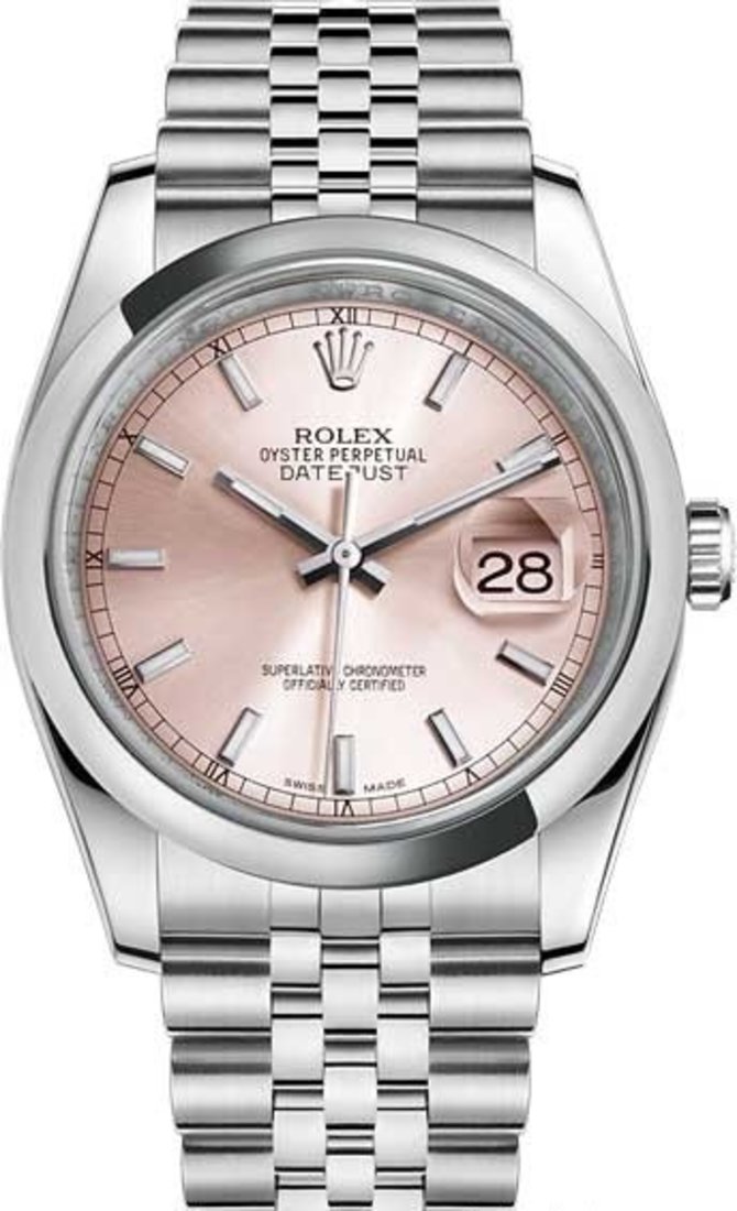 На розовом сатинированном циферблате наручных швейцарских механических часов Rolex Datejust Datejust 36 mm Steel установлены часовые метки и стрелки из стали со специальным люминесцентным покрытием белого цвета. Для защиты циферблата было установлено сапфировое стекло с циклопной увеличивающей линзой, которая находится над индикатором даты. Корпус круглой формы и браслет с раскладывающейся застежкой изготовлены из качественной нержавеющей стали. На циферблате индицируются часы, минуты, секунды, дата. Механический калибр с автоподзаводом обладает 48 часами запаса хода.