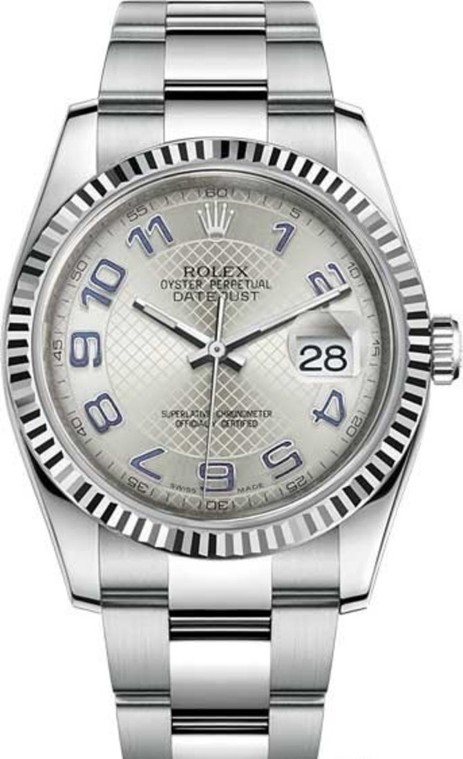 Из полированной стали и полированного белого золота сделаны корпус, браслет и застежка наручных швейцарских механических часов Datejust 36mm Steel and White Gold 116234-0155. Внутри корпуса со 100-метровым уровнем герметичности находится механизм с автоподзаводом и 48-часовым запасом хода, разработанный Rolex-ом. Его хронометрическую точность хода подтверждает официальный сертификат от COSC - швейцарского института хронометрии. Циферблат, обработанный методом гильоширования, закрыт стеклом из сапфира. Зона, где показывается текущая дата, накрыта специальной циклопной линзой, запатентованной компанией Rolex. Кончики стрелок покрыты люминесцентным составом.
