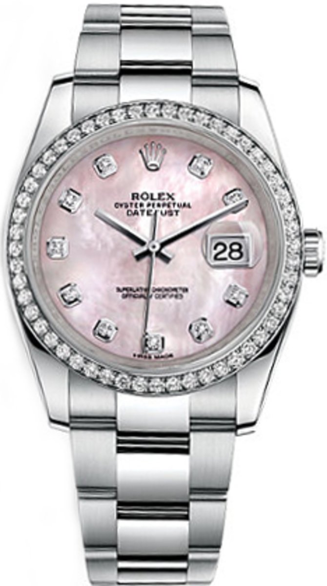 Комбинированный корпус наручных часов Datejust 36mm Steel and White Gold 116244-0018, изготовленный из стали и белого золота, отличается высокой водонепроницаемостью до 100 метров. Механизм с автоподзаводом, установленный здесь - мануфактурная работа инженеров-часовщиков марки Rolex, заслуженно отмеченная сертификатом сверхточного хронометра, который был выдан после прохождения необходимых испытаний швейцарским институтом хронометрии COSC. Браслет сделан в такой же комбинации, что и корпус. Зона для индикации даты накрыта циклопной линзой - стеклом с увеличивающим эффектом. Безель корпуса был инкрустирован белыми бриллиантами. Также бриллиантами украшен и циферблат часов.