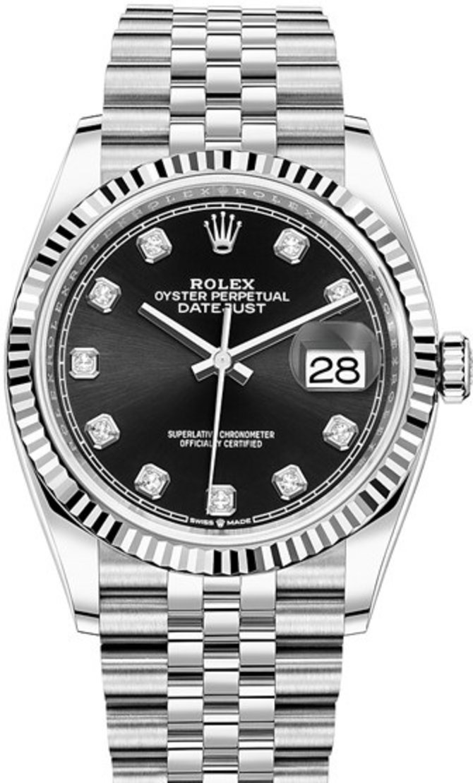 Классические женские швейцарские часы Rolex Datejust 36mm Steel and White Gold 126234-0027 обладают стандартным функциональным набором на каждый день: часы, минуты, секунды и дата. Модель выпущена швейцарской мануфактурой Ролекс в 2019 году в комбинированном корпусе из белого золота и нержавеющей стали, диаметром 36 мм. Рифленый безель сделан из белого золота. Калибр мануфактурной разработки часовщиков Rolex с автоматическим подзаводом, запасом хода на 48 часов и сертификатом хронометра от швейцарского института тестирования хронометров - COSC. Защитное стекло с лицевой стороны выполнено из сапфирового кристалла. Браслет Jubilee состоит из нержавеющей стали и белого золота и дополнен раскладывающейся пряжкой. Шикарный черный циферблат оснащен часовой разметкой в виде бриллиантов классической огранки. Индикатор даты показывает данные сквозь циклопную линзу.