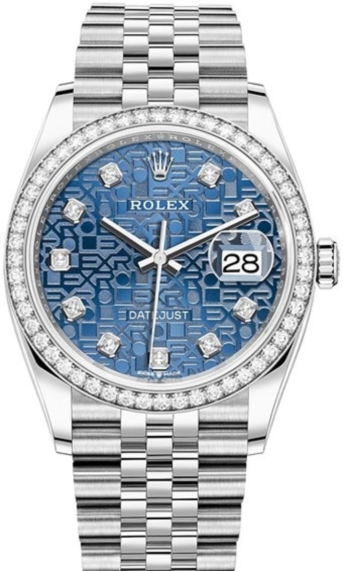 Швейцарские часы от знаменитой на весь мир мануфактуры Rolex - модель Datejust 36mm Steel and White Gold 126284rbr-0003 в круглом полированном корпусе с инкрустацией натуральными белыми бриллиантами с классической огранкой, выполненном из белого 18-каратного золота и нержавеющей стали в диаметре 36 мм. Ювелирный женский корпус имеет водонепроницаемость до 100 метров. Данные часов, минут, секунд и даты показываются на синем вручную гильошированном циферблате, накрытом стеклом из сапфира с антибликовым напылением. Автоматический механизм имеет запас хода до 48 часов и сертификат хронометра COSC. Часы поставляются с прочным браслетом из нержавеющей стали и белого золота фирменного типа JUBILEE с пятирядными цельными звеньями с раскладной застежкой. Безель корпуса украшен бриллиантами, а также часовая разметка представлена из бриллиантов.