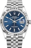 Швейцарские часы Rolex Datejust 36mm Steel and White Gold 126284rbr-0029 представлены знаменитой маркой в корпусе из белого золота и нержавеющей стали с безелем, украшенным белыми бриллиантами классической огранки. Синий сатинированный циферблат ручной работы имеет часовую разметку из натуральных белых бриллиантов классической огранки и апертуру даты, сверху которой установлено циклопное увеличительное стекло. Механизм с автоматическим подзаводом 3235 способен работать без подзавода до 70 часов. Высокая точность хода установленного калибра подтверждена сертификатом хронометра COSC. На запястье руки часы фиксируются комфортным комбинированным браслетом из стали и белого золота JUBILEE с раскладной пряжкой. Водонепроницаемость корпуса повышена до 100 метров. Часы, диаметром 36 мм, выпущены в 2019 году.