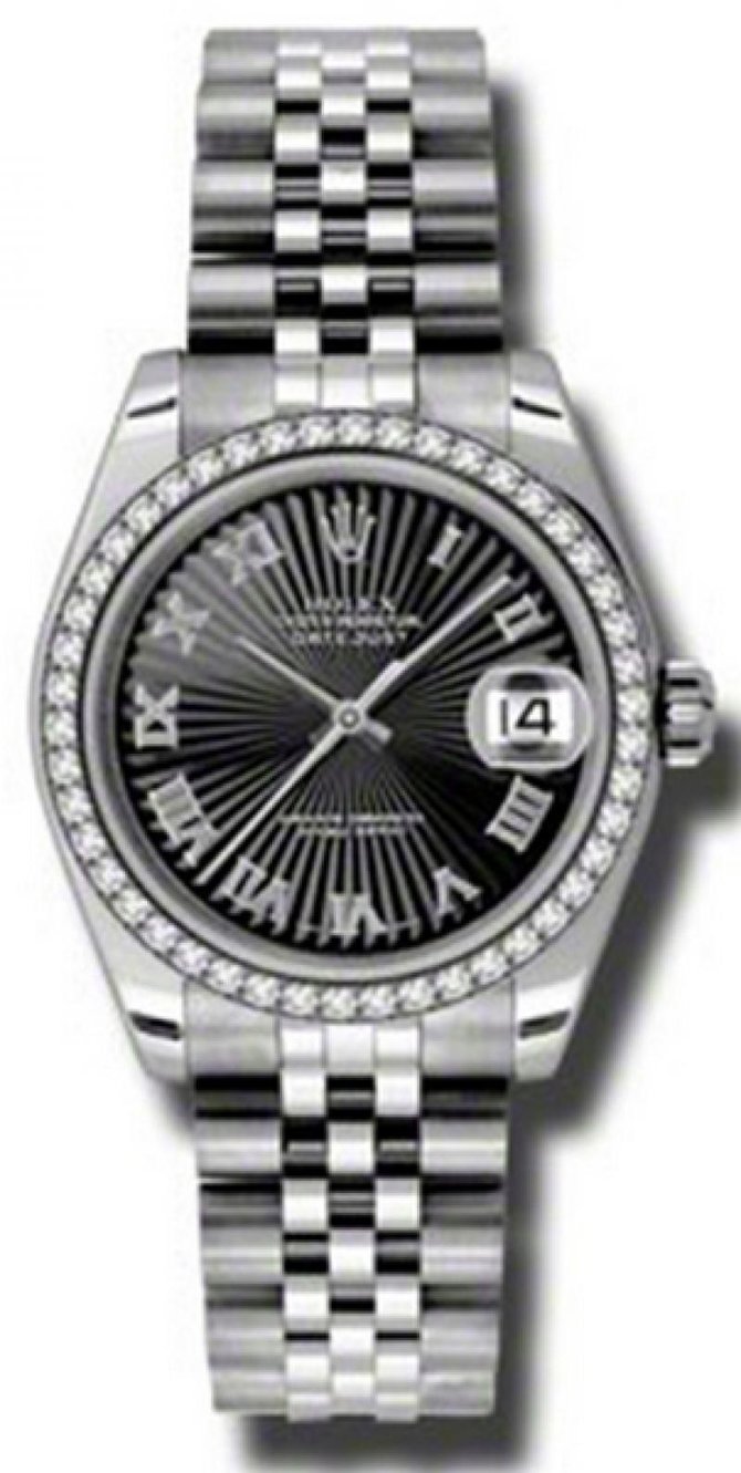 Модель часов Rolex Datejust 31mm Steel and White Gold Ref: 178384 bkio привлекает своей изысканностью: черный гильошированный циферблат, безель сверкает 46 белыми бриллиантами.